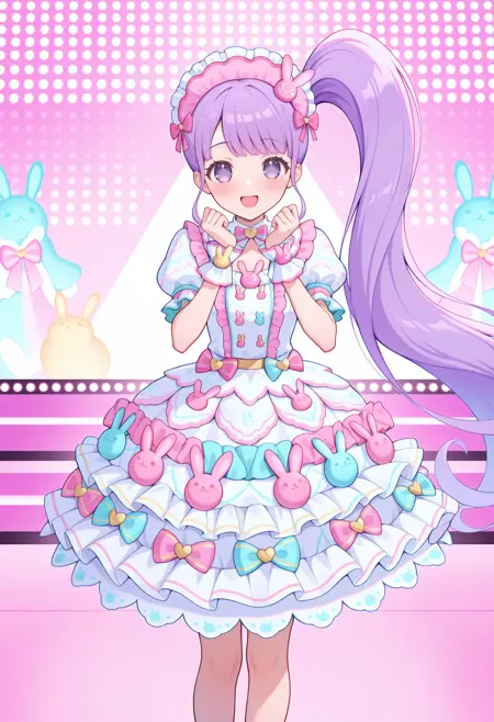 - pnonbny, pink headdress, frilled headwear, white dress, multicolored dress, pink bow, multicolored bow, puffy short sleeves, layered dress, print dress, dress bow, rabbit ornament, wrist cuffs, kneehighs, pink footwear, footwear bow,