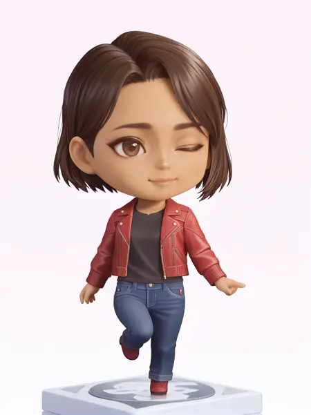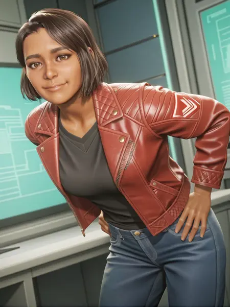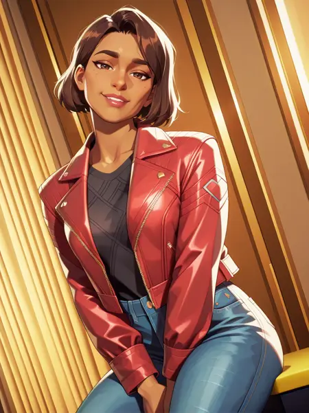 メインプロンプト:"短い髪、茶色の髪、茶色の目、赤い開いたジャケット、黒いシャツ、デニムパンツ"
