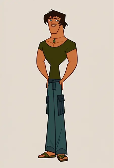JustinTDI, 1boy, short dark brown hair, blue eyes, dark green shirt, blue cargo pants, necklace with a green pendant, brown sandals, lips, big lips, brown lips, tan skin,