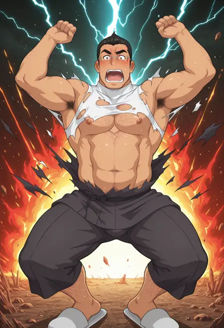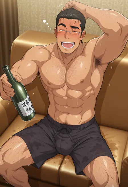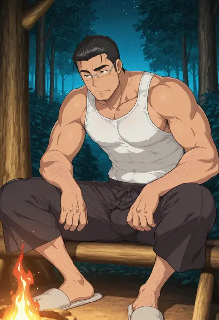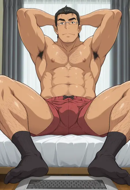 Kousaka_Daisuke, short hair, black hair, hair slick back, dark brown eyes, thick eyebrows, stubble, tan skin, sideburns, (semi-rimless eyewear),