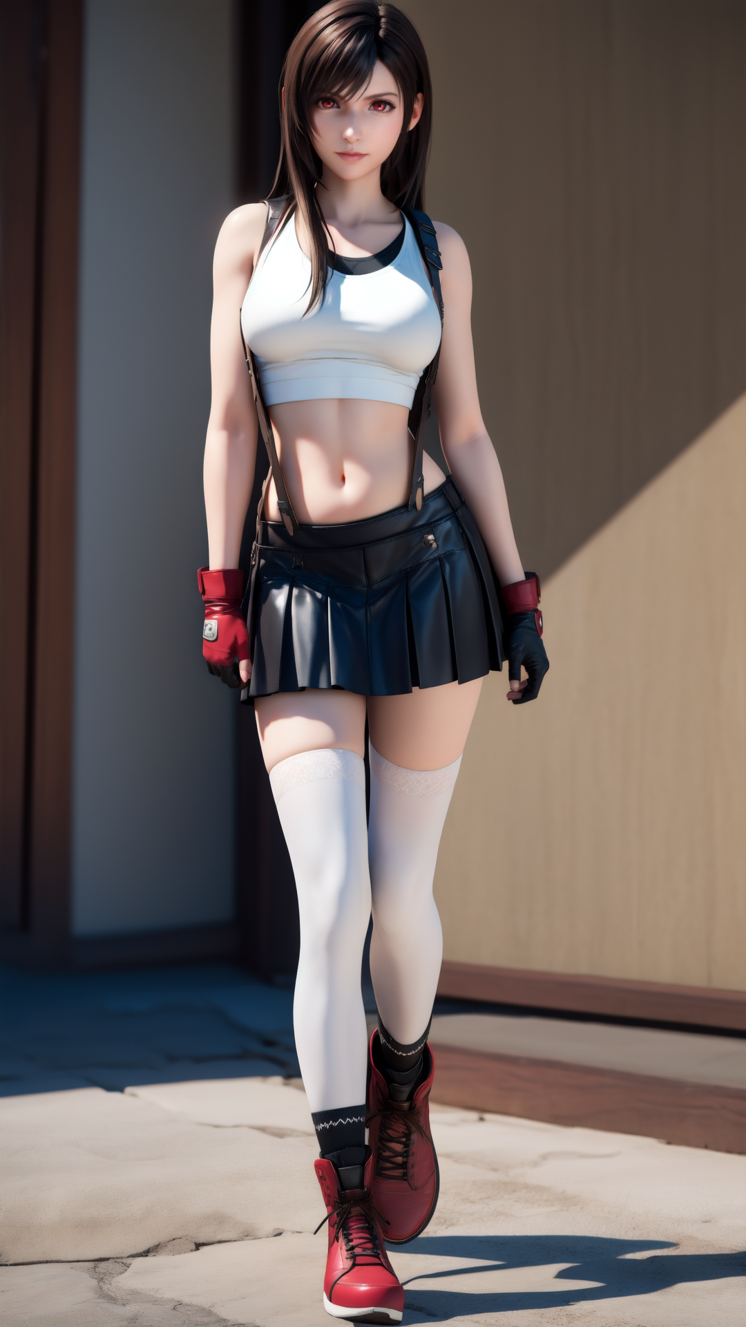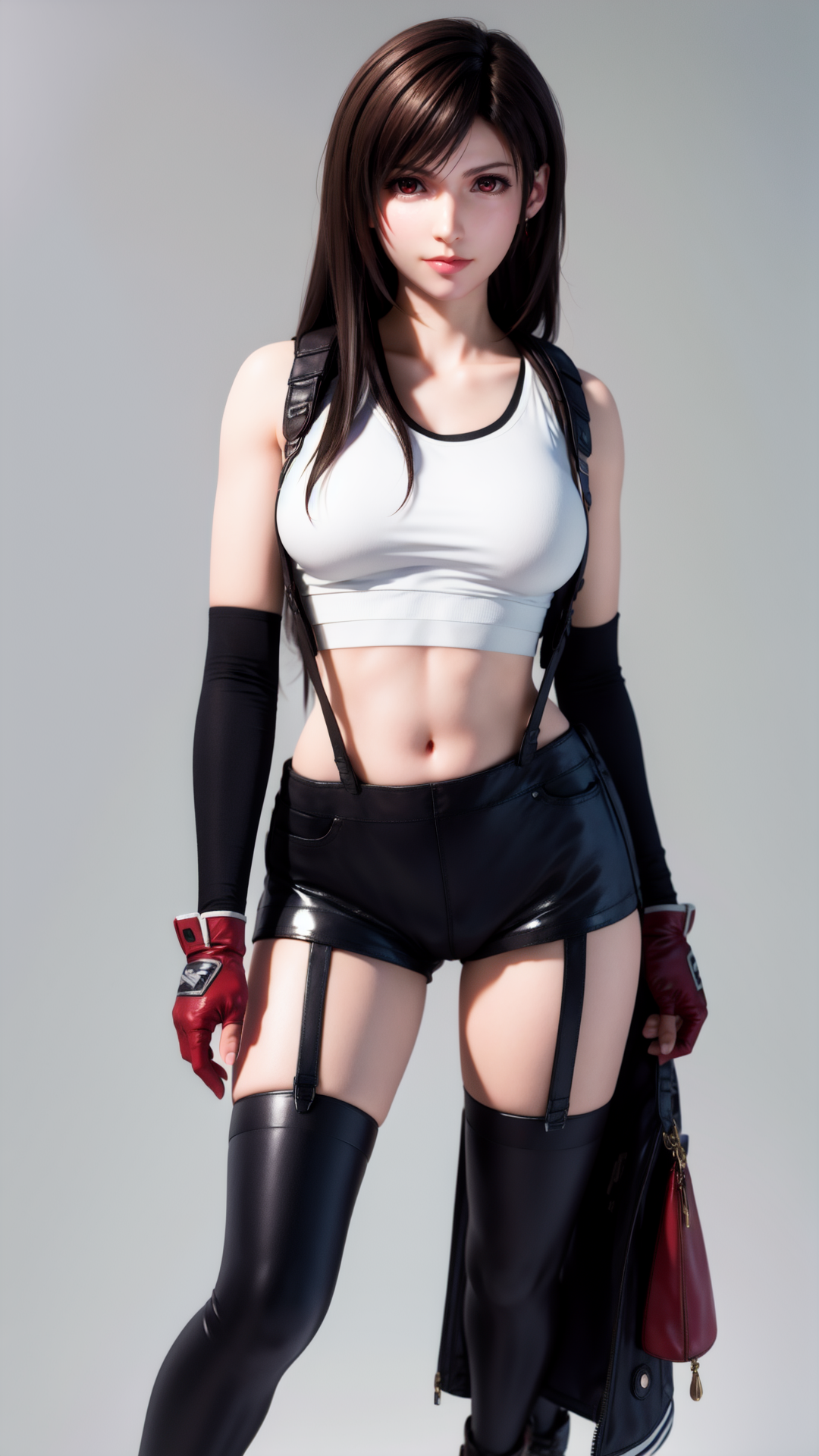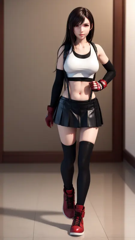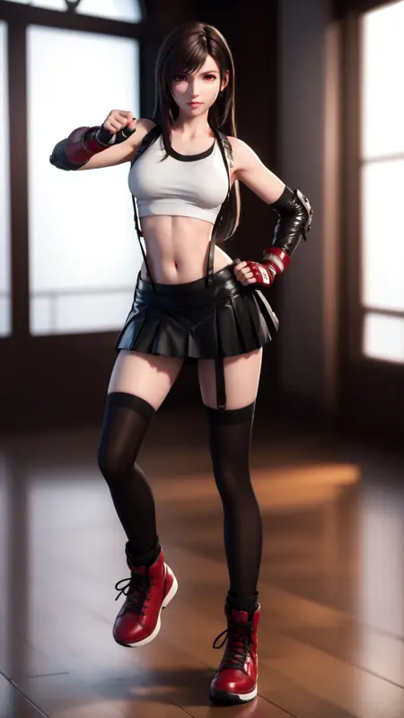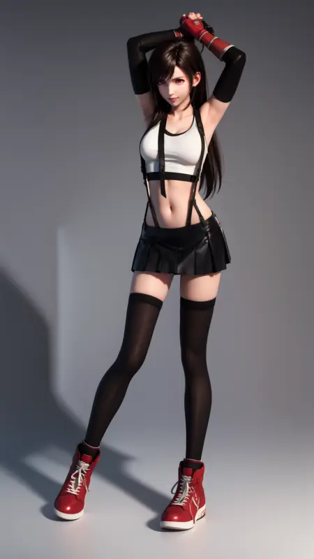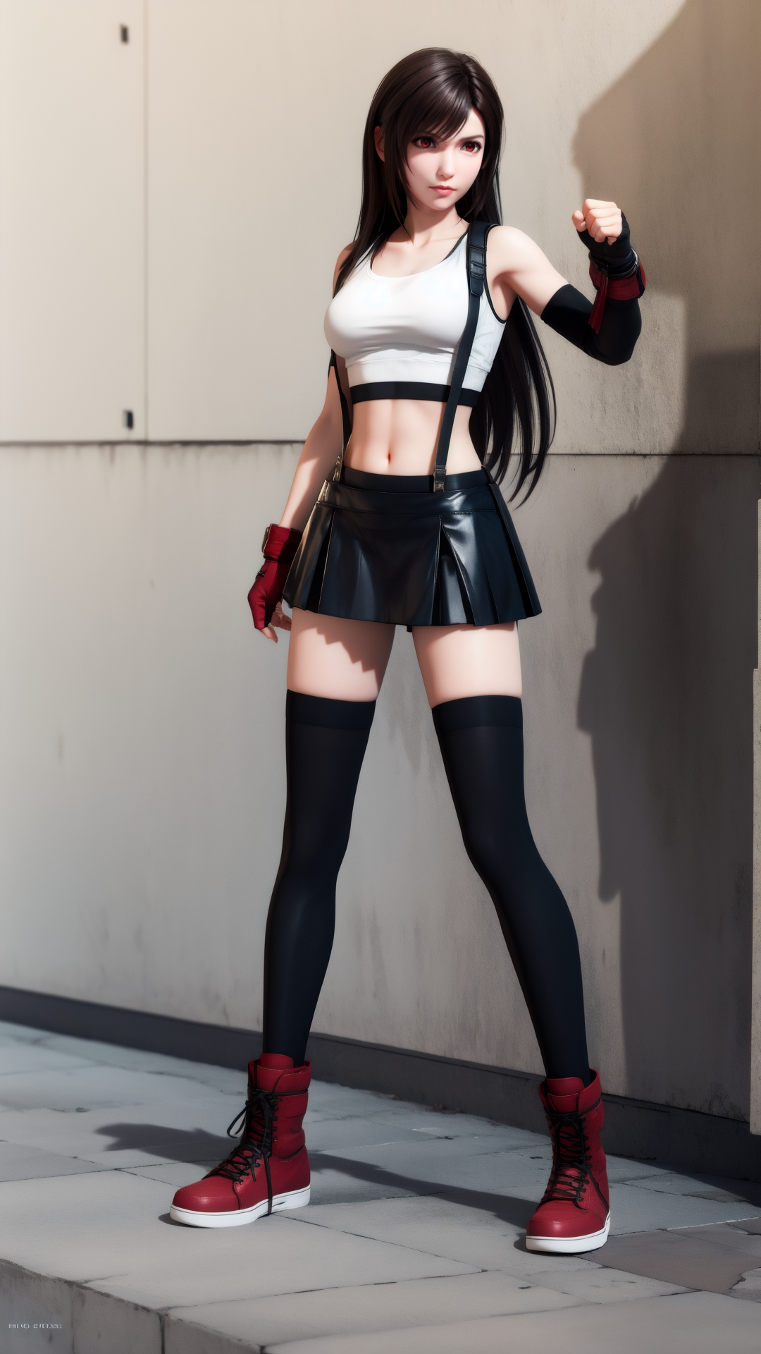 推奨プロンプト(Recommended prompt word): 1girl, tifa lockhart, solo, thighhighs, skirt, suspenders, long hair, crop top, gloves, red footwear, suspender skirt, black thighhighs, fingerless gloves, full body, tank top, black skirt, midriff, navel, elbow gloves, boots, black hair, white tank top, clenched hands, fighting stance, brown hair, full body, red eyes,