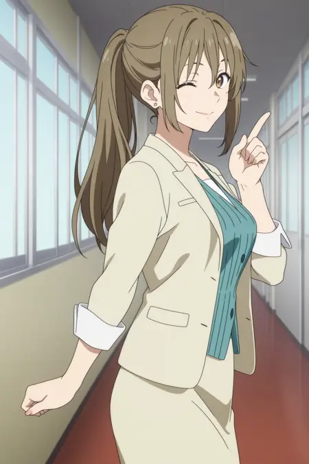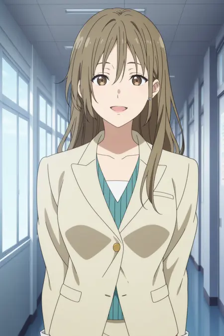 ninomiya shizuku, 长发, 棕发, 不对称鬓发, 轻薄刘海, 棕色眼睛, 钻石耳钉, 七分袖, 白色袖口, 棕色夹克, 水蓝色背心, 垂直条纹背心, 棕色裙子, 铅笔裙, 黑色丝袜, 黑色鞋履, 高跟鞋