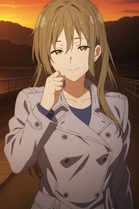 ninomiya shizuku, 长发, 棕发, 不对称鬓发, 轻薄刘海, 棕色眼睛, 钻石耳钉, 长袖, 灰色外套, 风衣, 双排扣, 蓝色衬衫, 黑色裙子, 铅笔裙, 灰色鞋履, 靴子