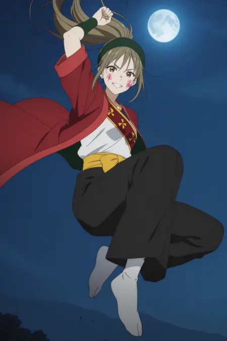 ninomiya shizuku, 长发, 棕发, 马尾辫, 不对称鬓发, 轻薄刘海, 挥着头巾, 棕色眼睛, 身体纹身, 面部彩绘, 钻石耳钉, 日本服装, 和服外套, 长外套, 红色外套, 开襟外套, 多色衬衫, 黑色长裤, 白色鞋履, 足袋