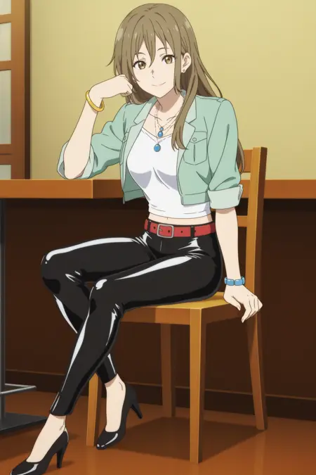 ninomiya shizuku, 长发, 棕发, 不对称鬓发, 轻薄刘海, 棕色眼睛, 钻石耳钉, 多条项链, 手镯, 七分袖, 袖子卷起, 绿色夹克, 开襟夹克, 短款夹克, 白色衬衫, 短款衬衫, 腰带, 黑色长裤, 乳胶裤, 黑色鞋履, 高跟鞋