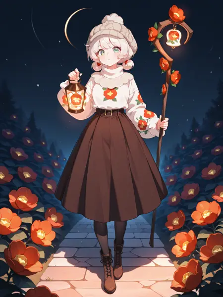CTCR, alt outfit, 1girl, white sweater, floral print, brown skirt, black pantyhose, long sleeves, beanie, long skirt, double bun, brown boots
