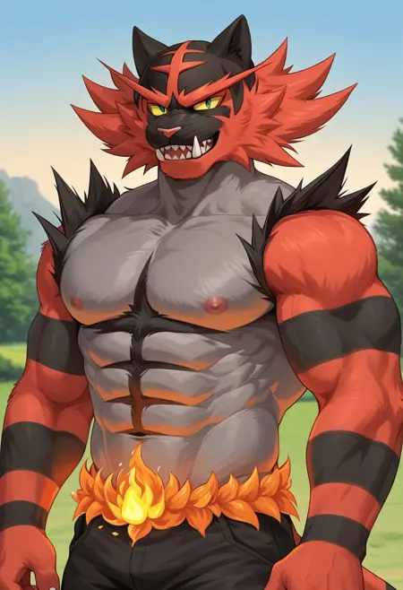 Anthro,incineroar,pokemon,red fur,black marks,yellow sclera,green eyes,muscular male