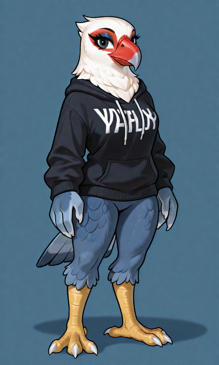 Amelia-AC, Eagle, red face, red beak with white tip, cyan eyelids, mascara, navy blue feathers with white tip, black eyes, white claws on the talons, yellow stripped bird feet, Tricolored feathered tail, Black pullover