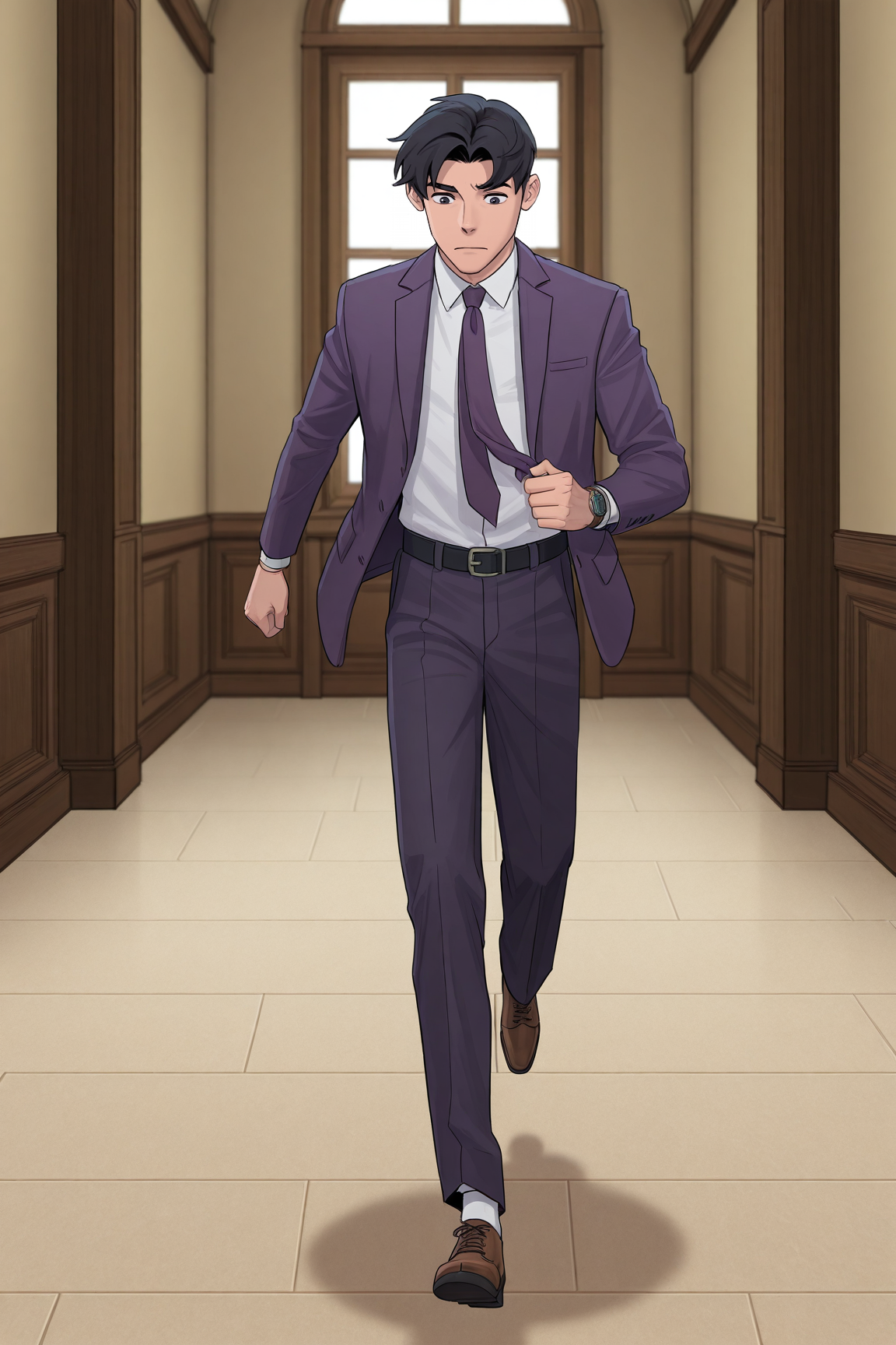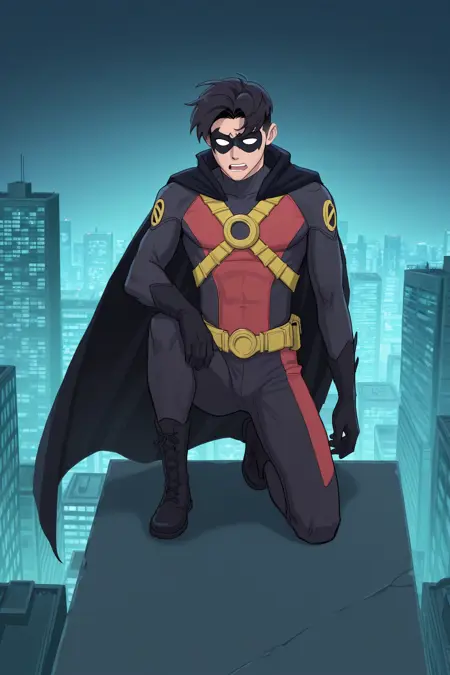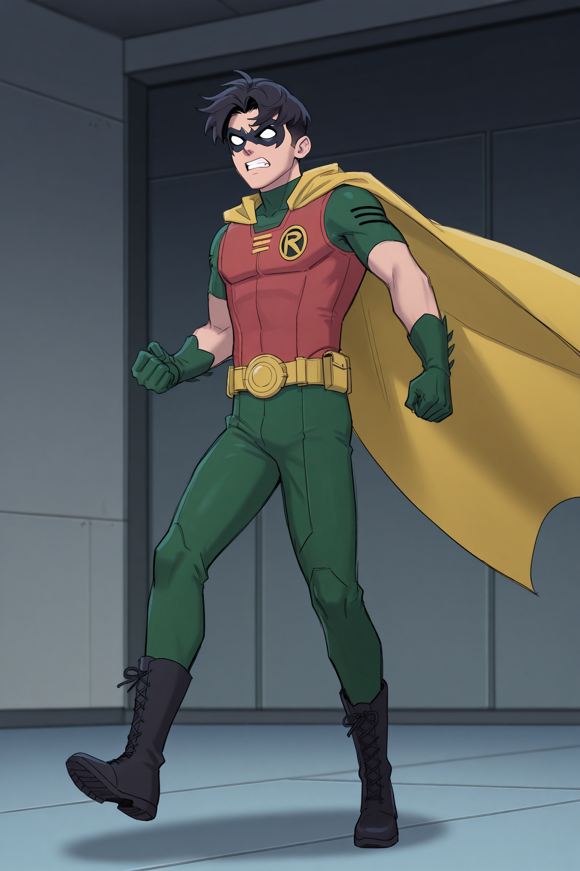도미노 마스크, 두 가지 색상의 바디슈트, 검은 장갑, 검은 망토, 노란 벨트, 검은 부츠, 가슴 하네스
