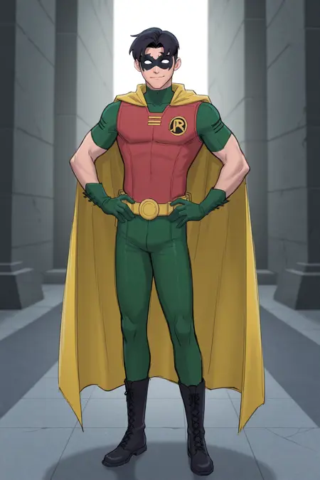 녹색 바디슈트, 빨간 조끼, 녹색 장갑, 노란 망토, 노란 벨트, 검은 부츠, 단축 소매
