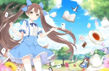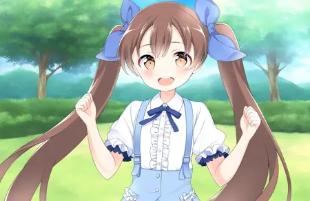 Mikumo_Anzu, 1girl, solo, twintails, brown hair, brown eyes, hair bow, very long hair, blue bow, flat chest,