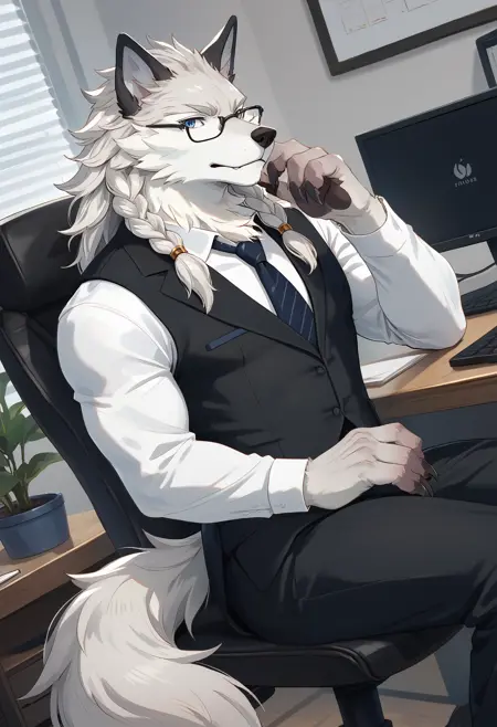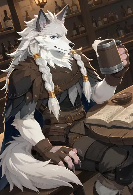 faramor, wolf, canine, anthro, braided hair, blue eyes, white fur, armor, cape, fingerless gloves