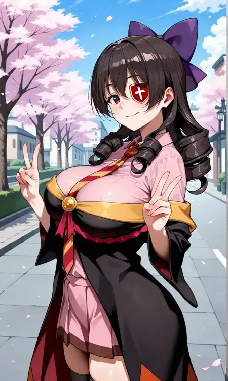 arue (konosuba), 붉은 눈, 안대, 검은 머리, 긴 머리, 드릴 머리, 옆머리, 보라색 리본, 머리 리본
