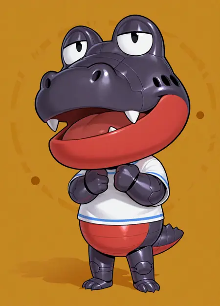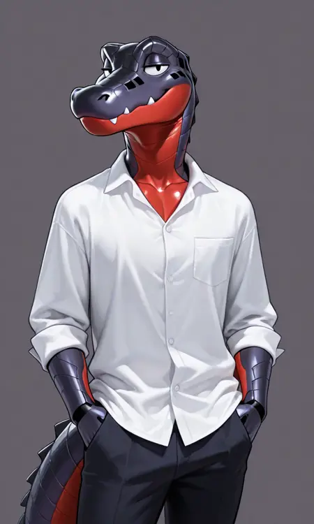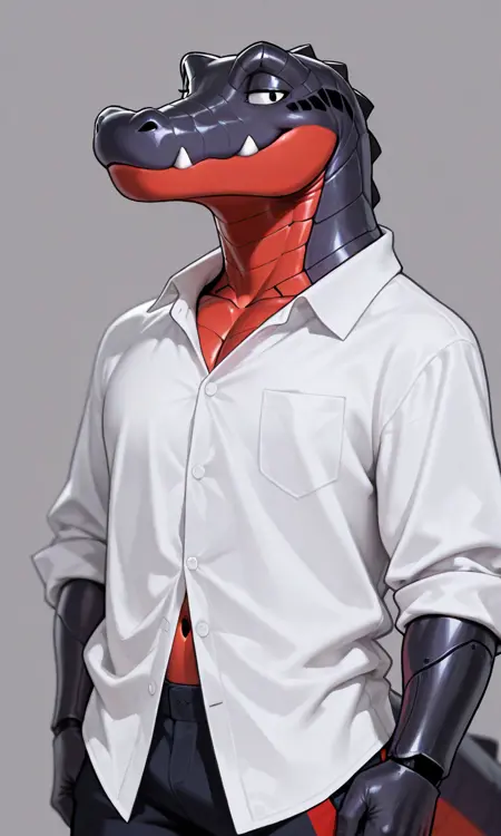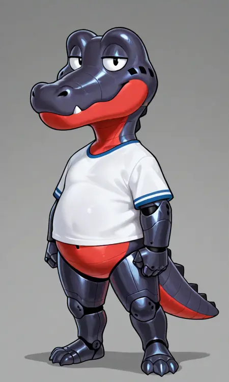 Del-AC, コロブス, 尾, 黒い目, 半開きの目, 尖った歯を出す, 暗い紫灰色の肌, 濃い赤い腹部, 濃い赤い下顎, マルチカラーの肌, 金属質の肌, 顔の側面の四角い穴, 青いストライプ入りの白いシャツ