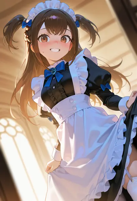외모 태그: 1girl, long hair, brown hair, ribbon, brown eyes, braid, hair bow, two side up, blue bow