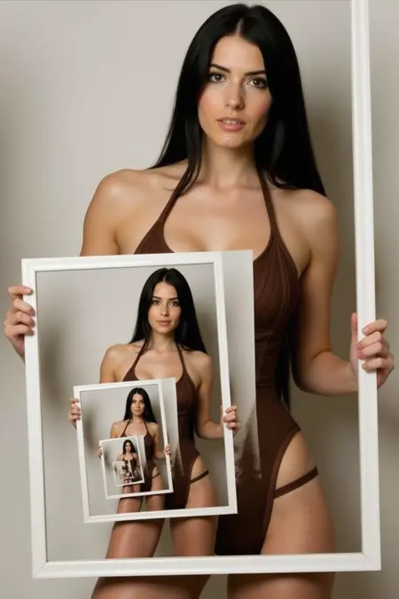 一位长发红发的女性,身着18世纪欧洲贵族服饰,一手持照片,repeat the nested images to Create an interesting visual loop effect