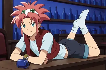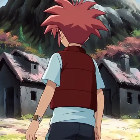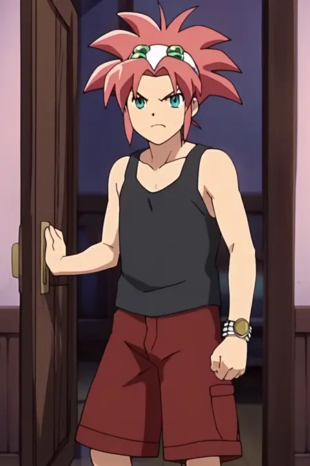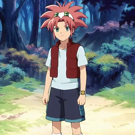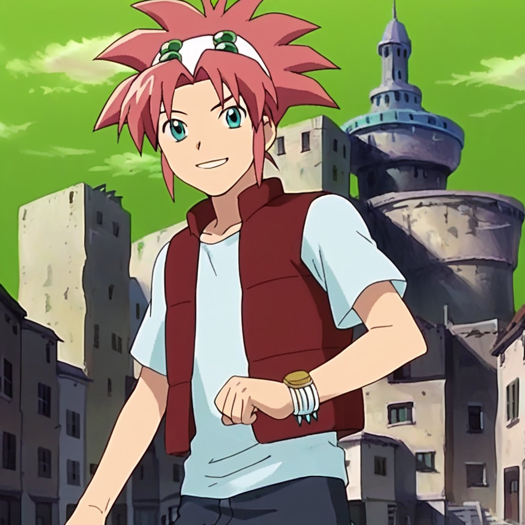 프롬프트: 남성, 분홍색 머리카락, 스파이크 헤어, 헤어밴드, 천연석 눈, 빨간 조끼, 흰 티셔츠, 반바지, 양말, 신발, 왼쪽 손목에 팔찌, 보석, 실내(여관/의자/병/화환), 실내(침실/문), 야외(정글/녹색 하늘/구름/나무), 야외(마을/녹색 하늘/구름/건물/분수), 야외(버려진 집)