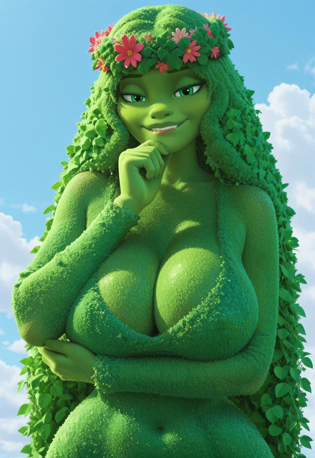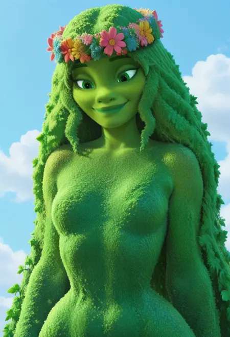 Disney, 1woman, Giantess, TeFiti, green eyes, flower crown, green skin, green-skinned female, colored skin, plant woman