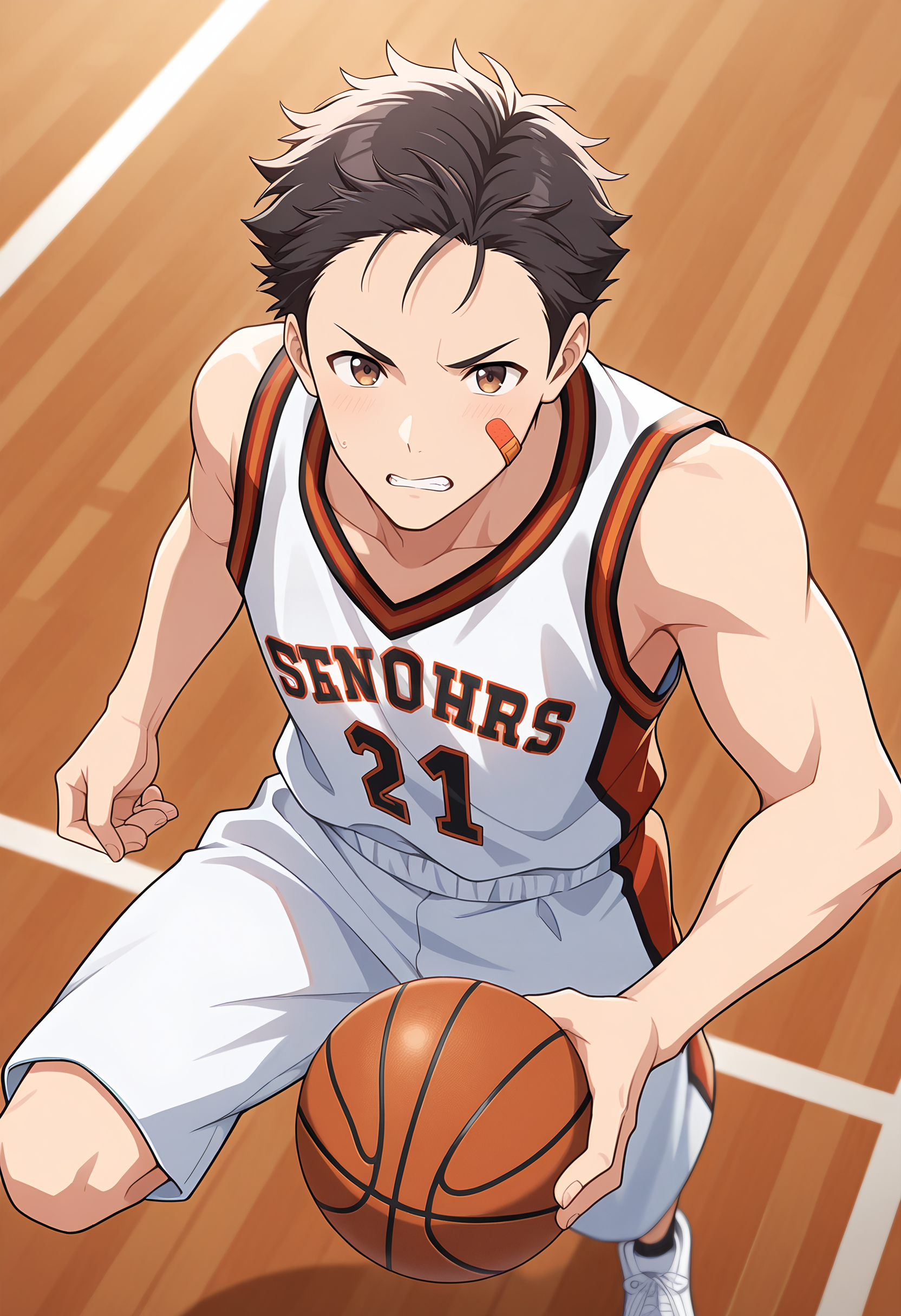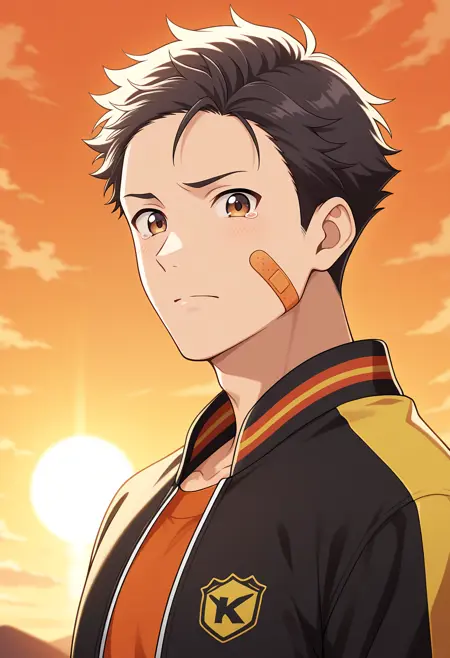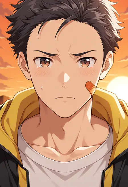 k1mur4_ry, black hair, brown eyes, bandaid, bandaid on face