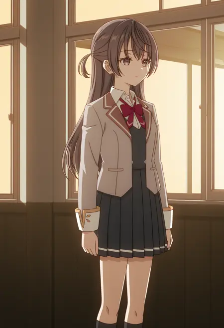 グレーのジャケット、黒のドレス、黒のソックス、赤いボウタイ、ニーハイ、白いシャツ