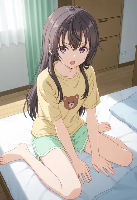 短袖、薄黄色のTシャツ、クマのパターン、薄緑のショートパンツ