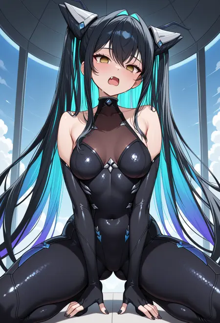 shimermaid, black bodysuit, scale bodysuit, long hair, very long hair, black hair, yellow eyes, twintails, multicolored hair, headgear, bare shoulders, detached sleeves, medium breasts, black gloves, elbow gloves, fingerless gloves,