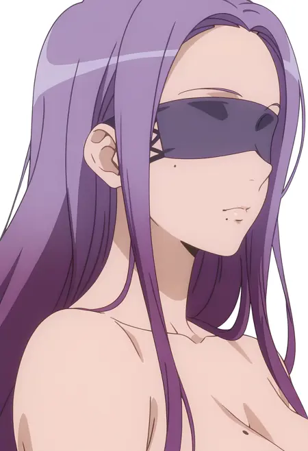 gorgon/cnn, long hair, 1girl, cleavage, large breasts, purple hair, mole,