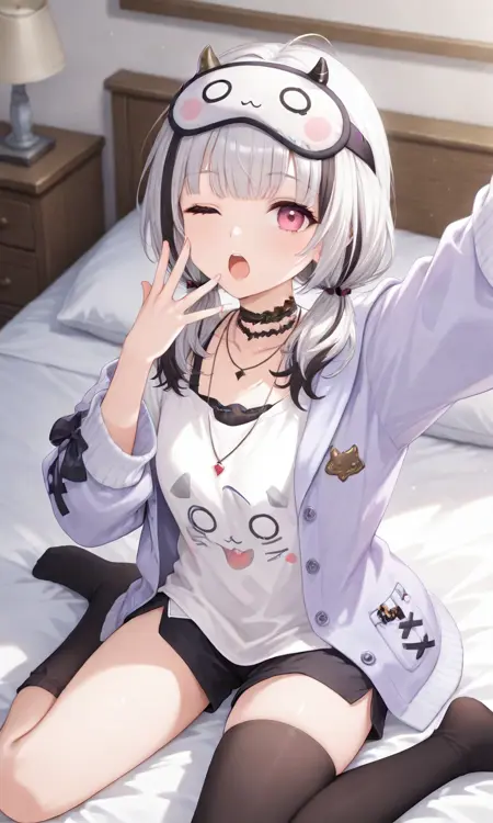 asumi cozy, low twintails, sleep mask, mask on head, lace choker, necklace, white shirt, loose shirt, purple jacket, black shorts, asymmetrical legwearsleep mask, mask on head를 제거할 수 있습니다.purple jacket를 제거할 수 있습니다.헤어스타일을