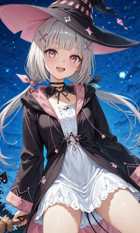 asumi sena, asumi witch, low twintails, x hair ornament, witch hat, black choker, sleeveless dress, white dress, robe, demon tailrobe를 제거할 수 있습니다.