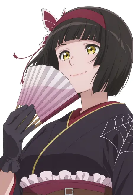 Mio/Cnn, 1girl, short hair, bangs, blunt bangs, black hair, yellow eyes, hairband, butterfly hair ornament,