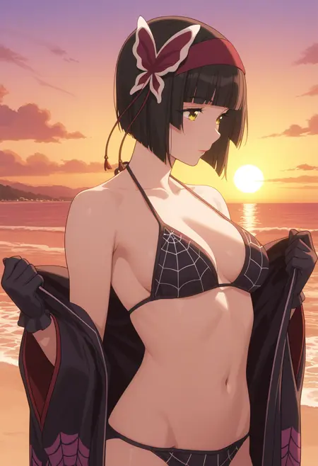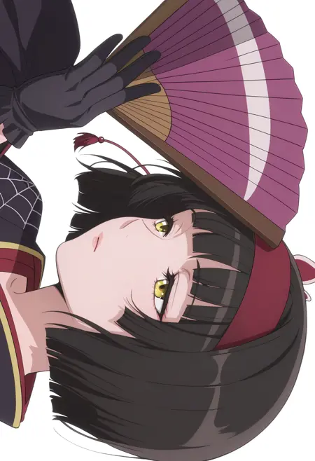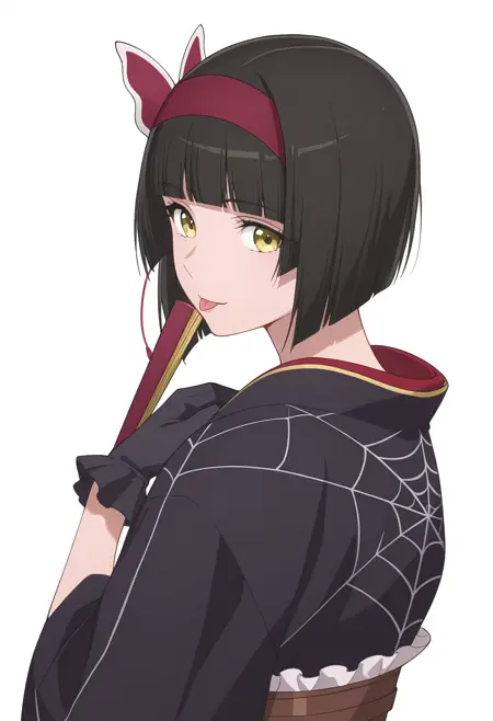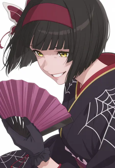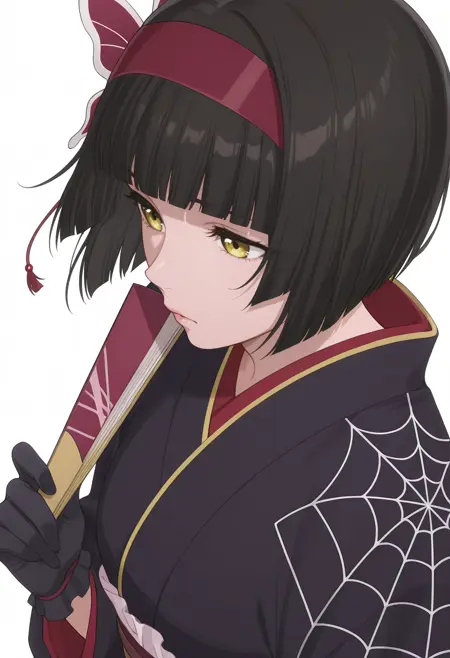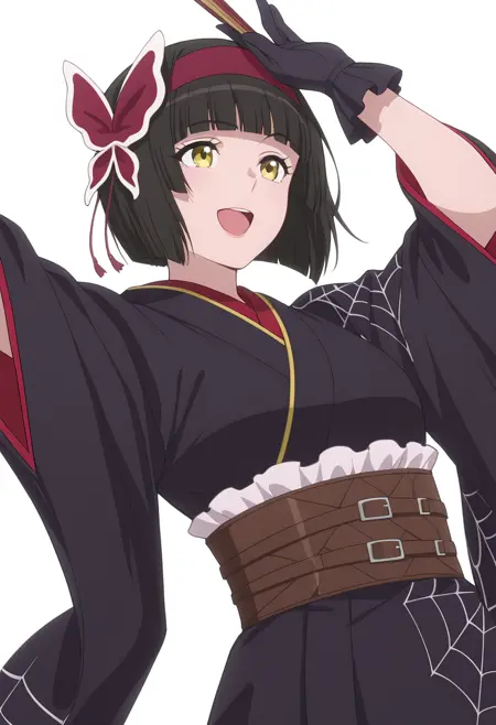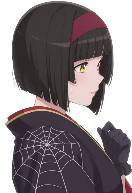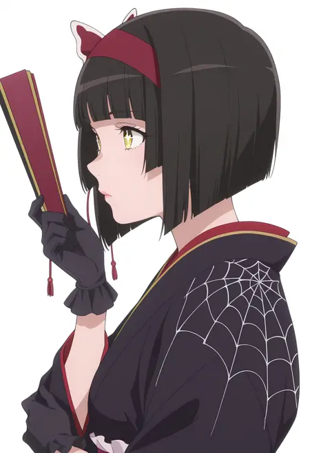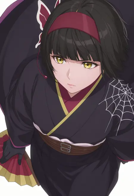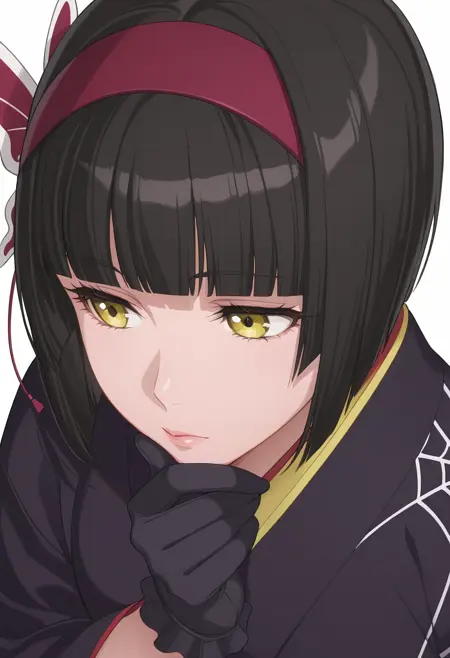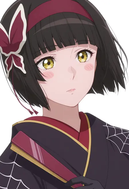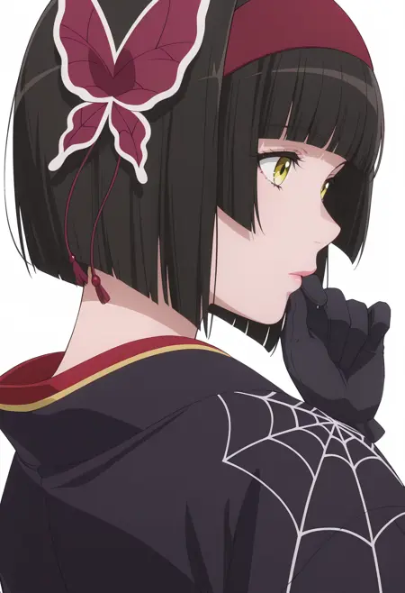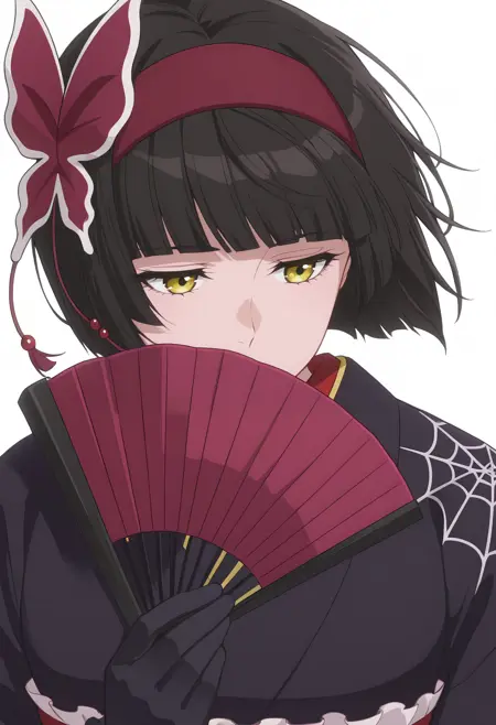 Mio/Cnn, 1girl, short hair, bangs, blunt bangs, black hair, yellow eyes ,hairband, butterfly hair ornament,