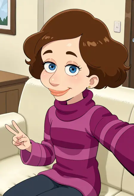 衣装: ピンクとパープルのストライプ入りタートルネックセーター、ネイビーブルーのスキンニーパンツ、薄茶色の冬用ブーツ