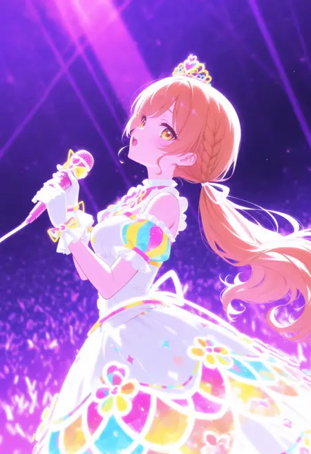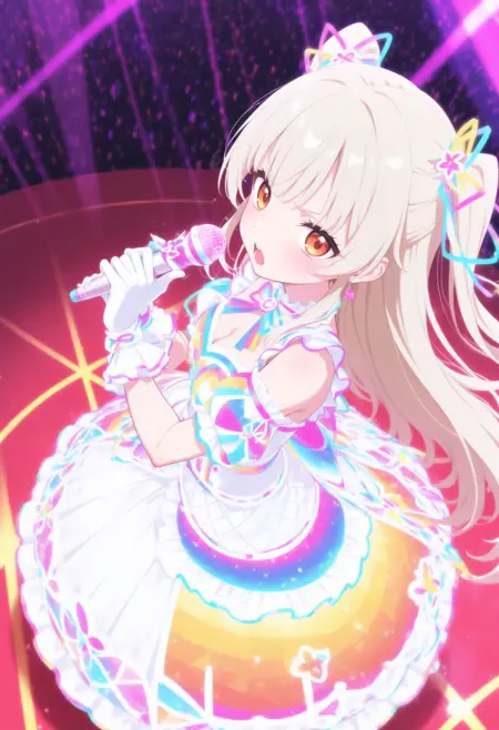トリガーだけだと中途半端に光ったり会場も再現しないので idol,idol clothes,colorful,multicolored dress, glowing clothes ,cyber fashion ,glowing ,stage,microphone,stage lights,sparkle,concert, singing, dancing 辺りからお好みのプロンプトで補強して下さい。
