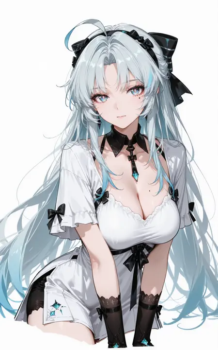 전신(악화 상태): carlotta montelli\(turn to the dark side\)\(wuthering waves\),1girl,solo,grey hair,blue hair,(black bow:1.3),long hair,very long hair,ahoge,hairband,hair bow,ribbon,red pupils,blue eyes,there is a black crack under the right eye, medium breasts,breasts,gloves,black gloves,dress,white dress,parted bangs,short dress,thighhighs,black thighhighs,boots,black footwear,