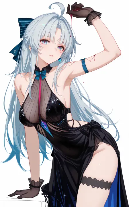 머리(악화 상태): carlotta montelli\(turn to the dark side\)\(wuthering waves\),1girl,solo,grey hair,blue hair,(black bow:1.3),long hair,very long hair,ahoge,hairband,hair bow,ribbon,red pupils,blue eyes,there is a black crack under the right eye,