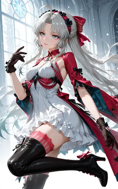 전신(일반 상태): carlotta montelli\(wuthering waves\),1girl,solo,very long hair,long hair,grey hair,ahoge,parted bangs,ribbon,red bow,hairband,hair bow,bow,blue eyes, breasts,medium breasts,dress,gloves,black gloves,short dress,red long upper shan,thighhighs,black footwear,bow,frills,high heel boots,boots,red bow,striped bow,