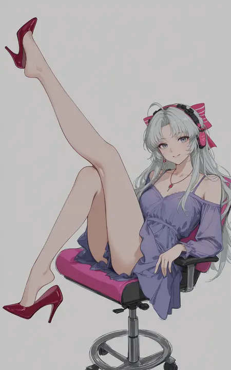 전신: carlotta montelli\(wuthering waves\),1girl,solo,long hair,red lips,makeup,jewelry,gloves,thighhighs,full body,dress,black gloves,breasts,high heels,grey hair,standing,ahoge,bow,thigh boots,boots,black footwear,hair bow,black thighhighs,medium breasts,white dress,short dress,