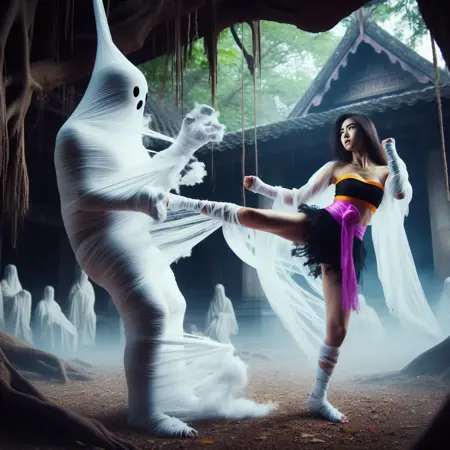 泰国女鬼,美丽的长发,身着华丽的白色闪亮丝绸长袍,通过丝线将丝绸释放并缠绕在一名惊恐男子的脖子上,将他包裹成蚕茧,宫殿中充满了被蚕茧包裹的人,照片级写实