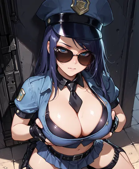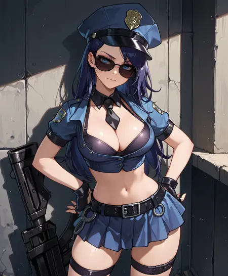collar, black tie, blue crop top, black bra, midriff, fingerless gloves, belt, mini skirt