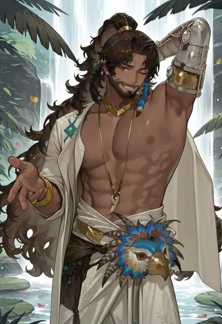 태그: sh4mane, sh4mane_b, 갈색 머리, 갈색 눈, 매우 긴 머리, 꼬리머리, 수염, 단일 기계 팔, 보조기, 검은 피부 남성