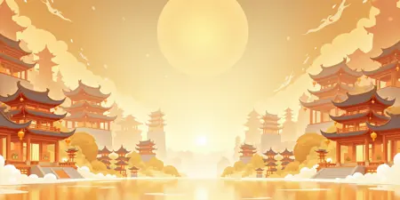 예시: gmic scene_/(game scene/),Grand vista of a serene, stylized Asian city. Symmetrical arrangement of traditional Chinese pagodas and buildings, rich warm orange and red hues. Golden, soft lighting casts a warm glow, creating a tranquil and peaceful atmosphere. Buildings feature intricate architectural details, tiered roofs, and numerous paper lanterns that hang from the eaves. A body of water of a golden, orange color, reflecting the warm light, runs in the foreground, separating the buildings. The scene exudes a sense of tranquility and harmony. Soft, fluffy clouds or mist float around the buildings, lending a dreamy quality. A calm, gentle breeze is suggested by the floating petals. Detailed rendering of textures and materials, including wooden structures, stone walls, and flowing fabrics, creates a sense of depth and realism. Composition is centered, with a perspective that emphasizes the vastness of the city and the calmness of the scene. Oriental-inspired style, anime art style, serene mood, tranquil atmosphere. Detailed perspective, vibrant warm colors. Gentle lighting, soft gradients.