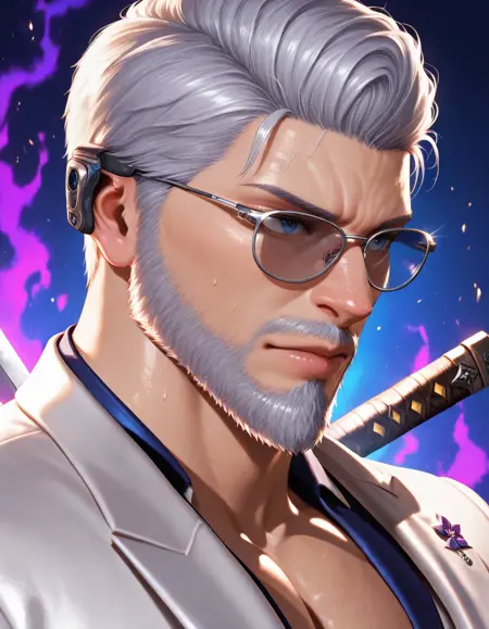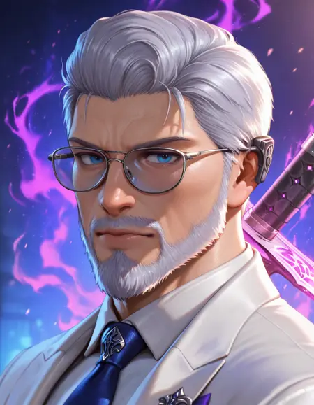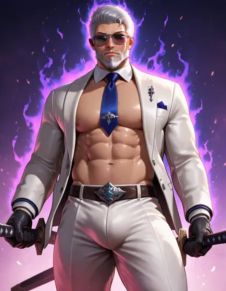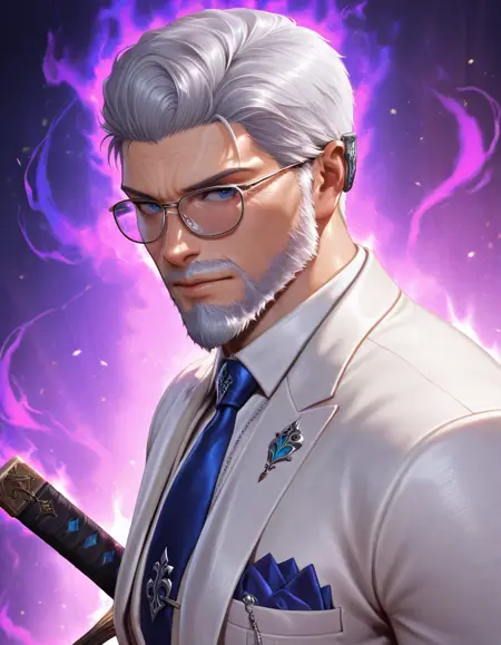 VICTOR CHEVALIER, BEARD, GLASSES, SWORD, SUIT, WHITE SUIT, WHITE PANTS