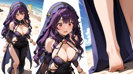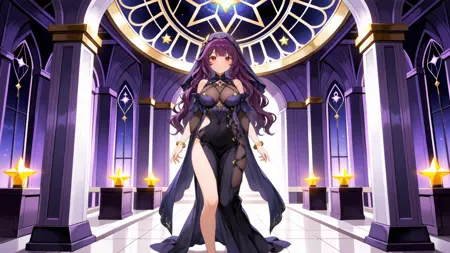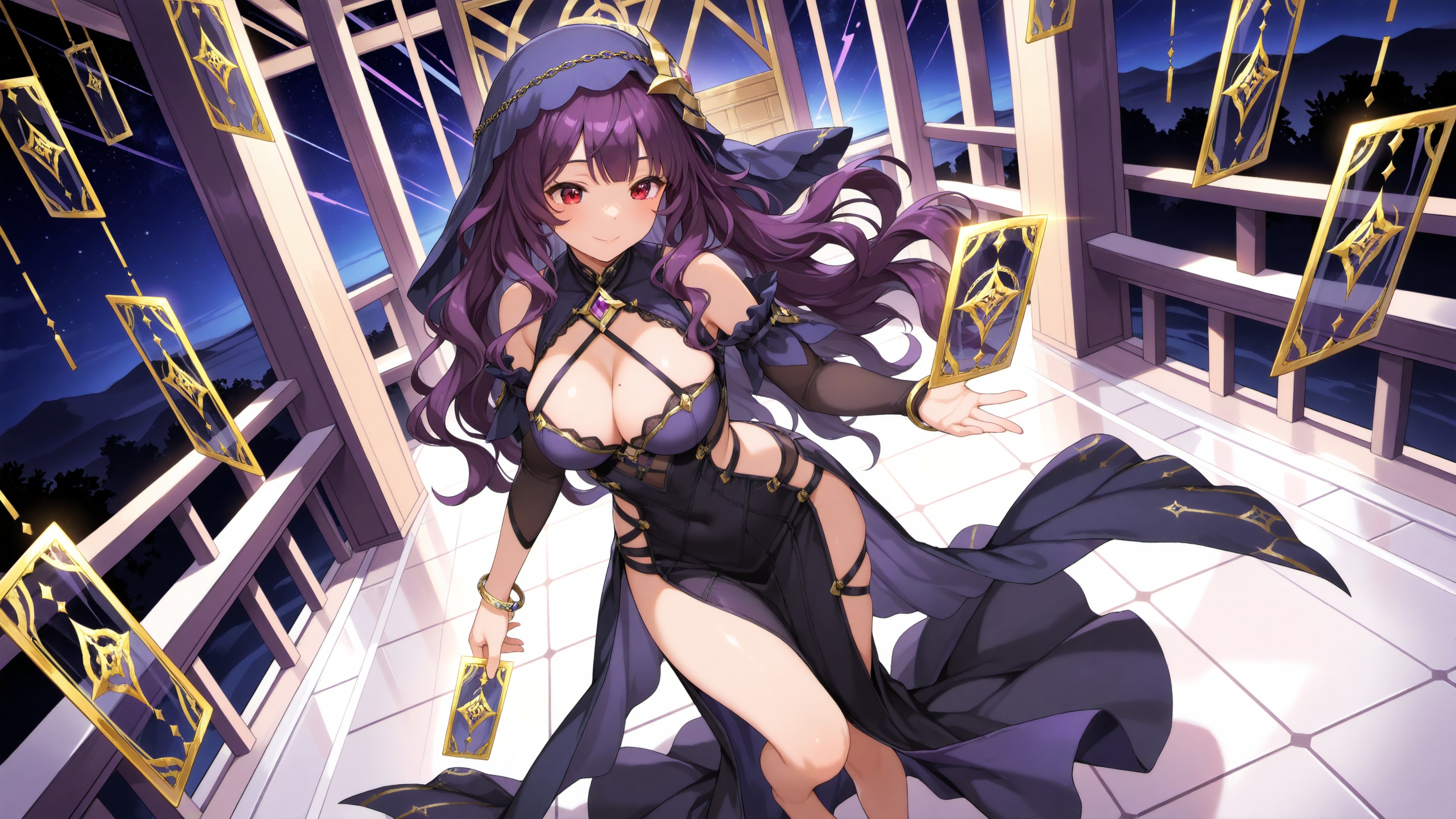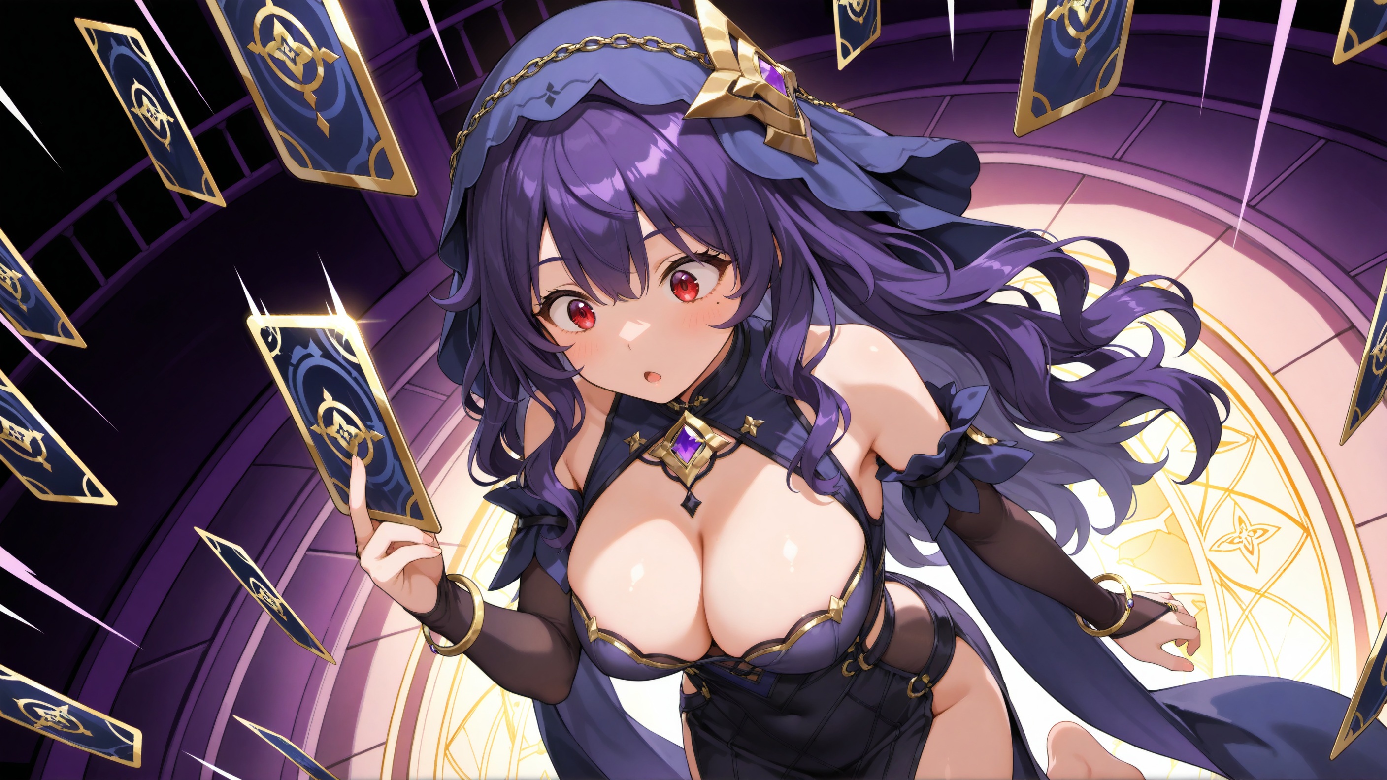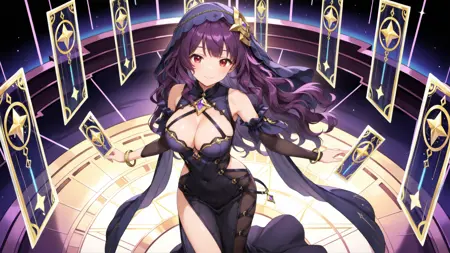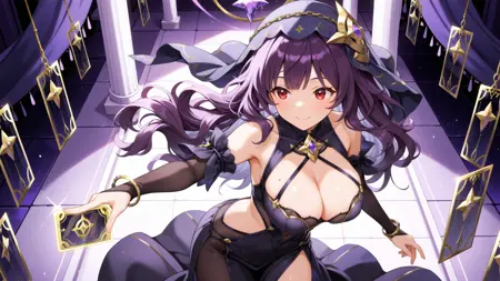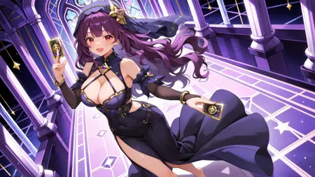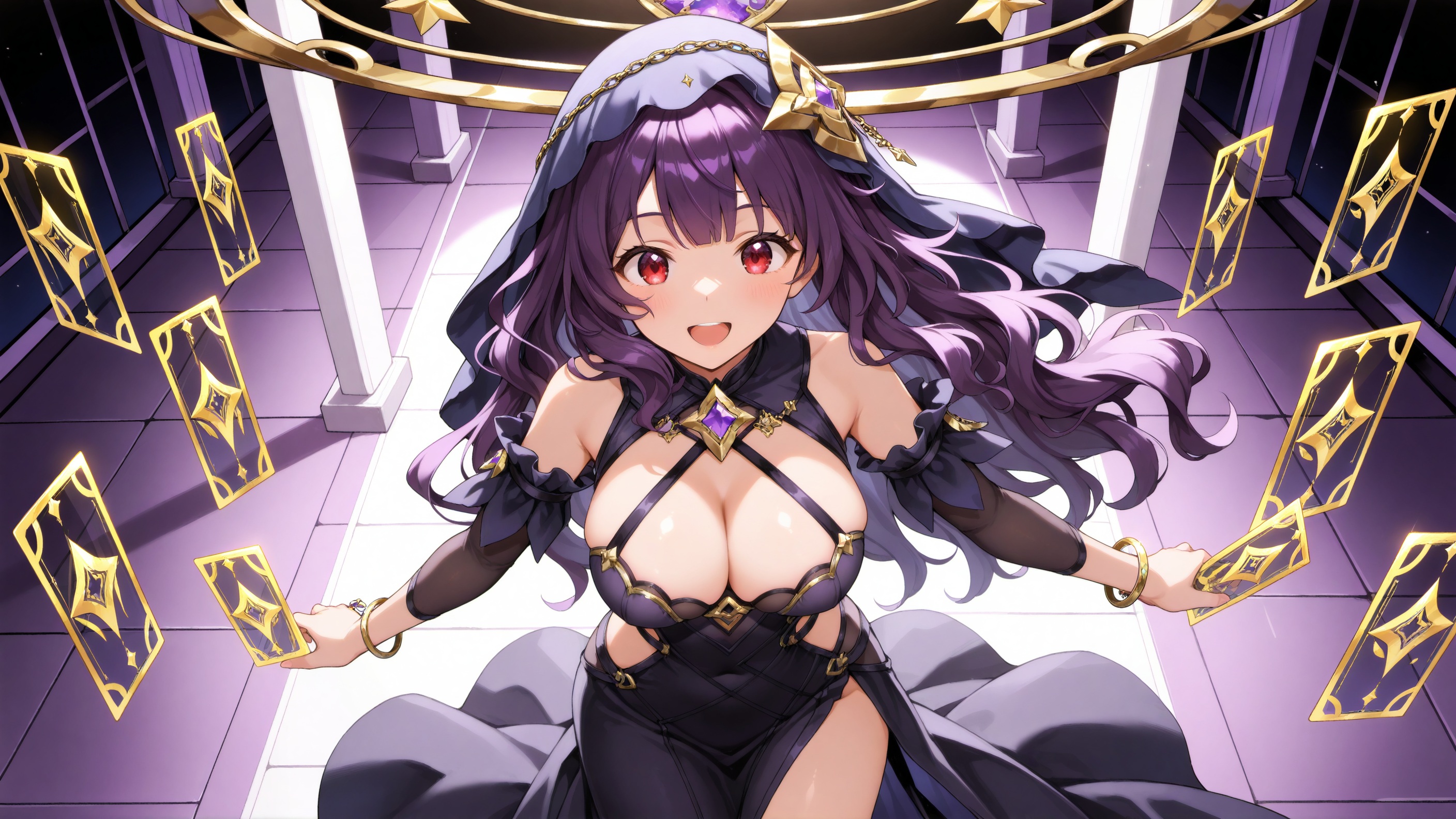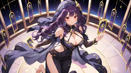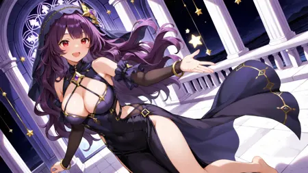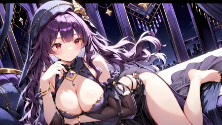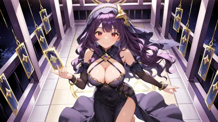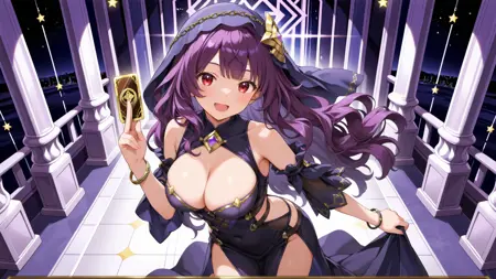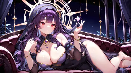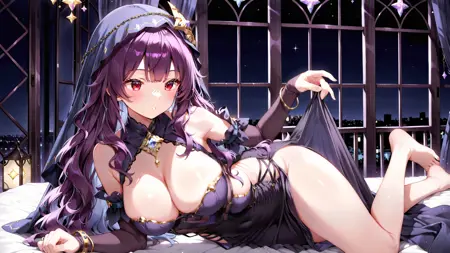 正面提示:(1girl, solo, black dress, veil, purple long wavy hair, large breasts, bare shoulders, bracelet, barefoot, jewelry, bangs, red eyes, cleavage, detached sleeves, star symbol)
