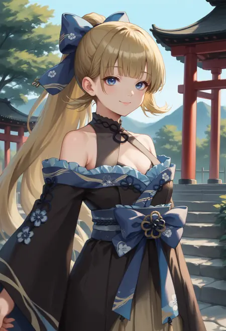 H4nabusaNwyrs, blue eyes, blonde hair, long hair, ponytail, hair bow, blue bow, halterneck, bare shoulders, multicolored kimono, black kimono, blue kimono, frills, blue obi