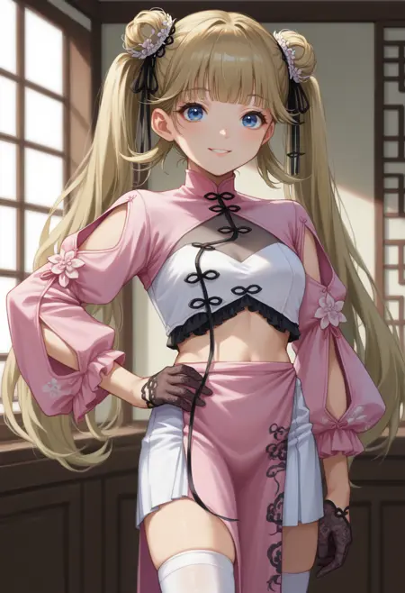 H4nabusaChs, blue eyes, blonde hair, long hair, twintails, double bun, hair ornament, chinese clothes, pink shrug \(clothing\), white crop top, see-through cleavage, lace gloves, half gloves, midriff peek, white skirt, pink pelvic curtain, white thighhighs