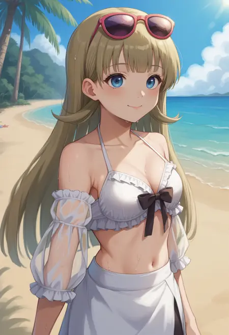 H4nabusaSum, blue eyes, blonde hair, long hair, sunglasses on head, white bikini, frilled bikini, detached sleeves, see-through sleeves, black ribbon, bikini skirt, white skirt