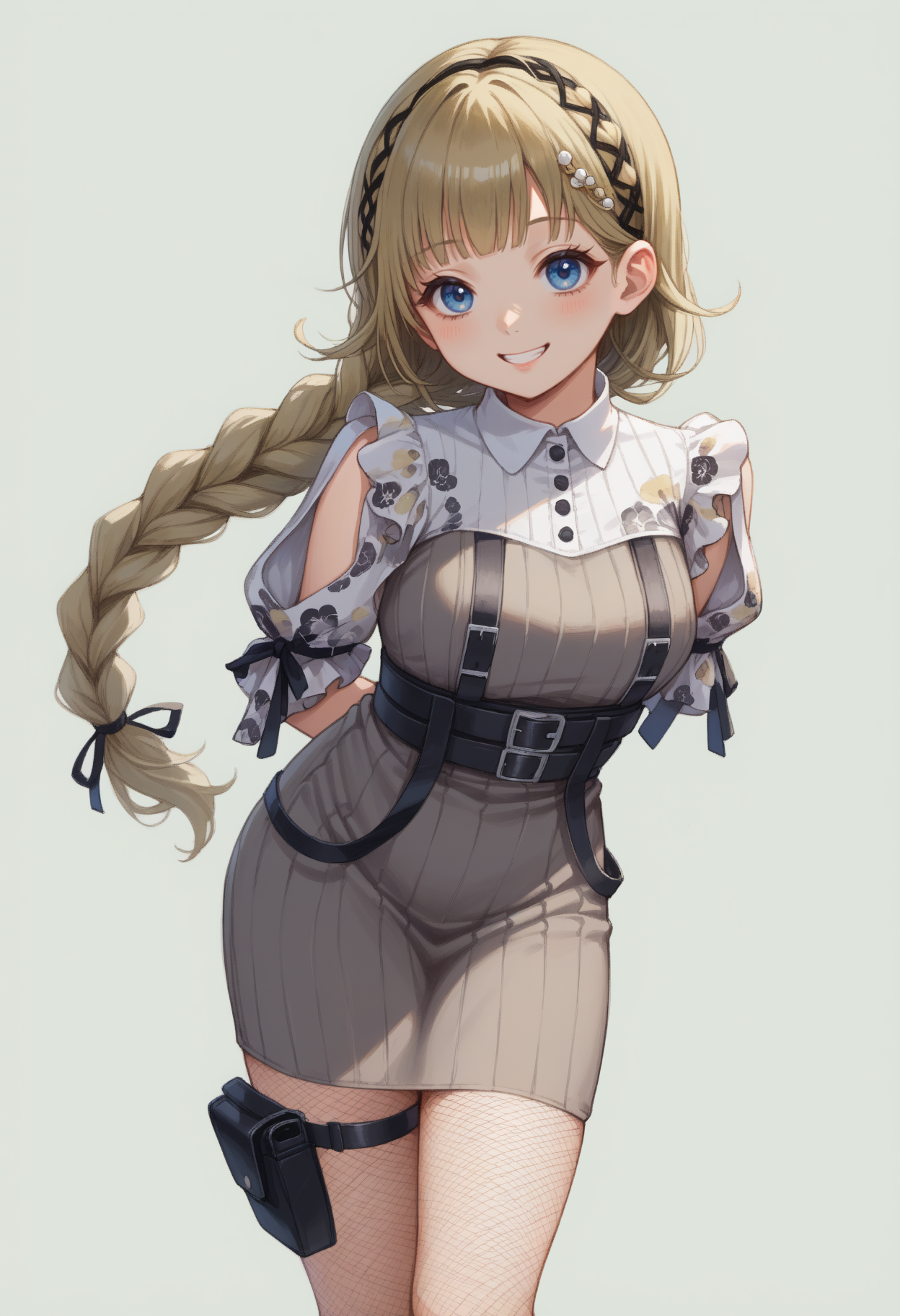 H4nabusaStrt, blue eyes, blonde hair, long hair, braided ponytail, hairband, hairclip, white shrug \(clothing\), floral print, grey dress, ribbed dress, sleeveless dress, multiple belts, black belt, black gloves, fingerless gloves, thigh holster, fishnet pantyhose