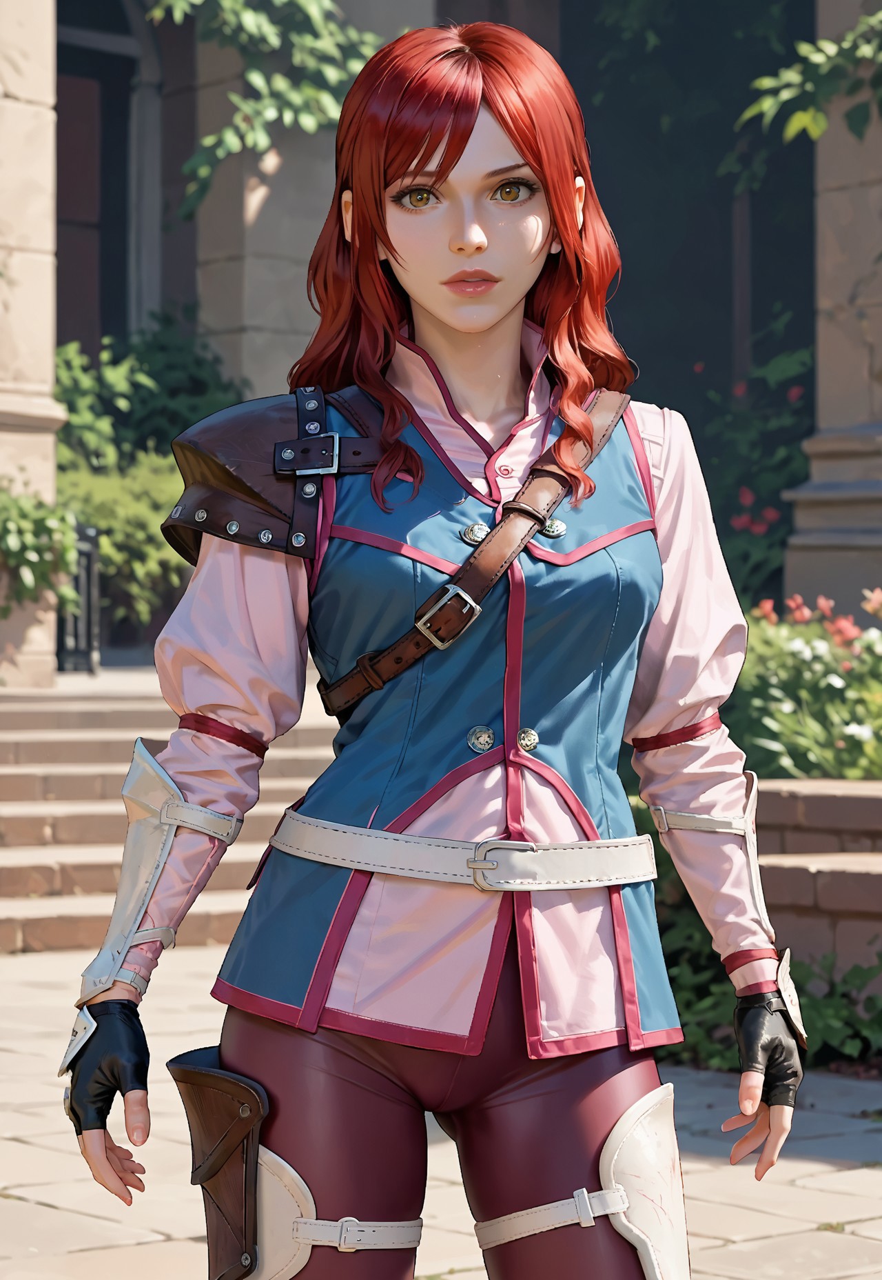 联盟风格 - 粉色衬衫、背心、紧身裤、单肩护甲、护臂、腰带、腿部护甲、露指手套,