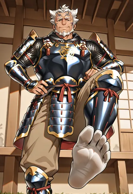 1boy, solo, male focus, fugen, old man, facial hair, white hair, grey hair, short hair, muscular, facial tattoo, dark brown eyes, white eyebrows, tan skin