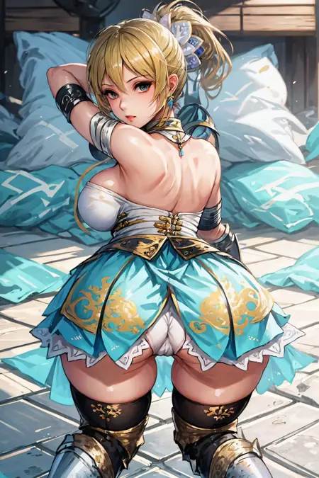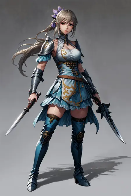 드레스, 치마, 히그스, 무기, 풀바디, 옆을 바라보는, 시청자 바라보는, 플랫테일, 금발, 갑옷,